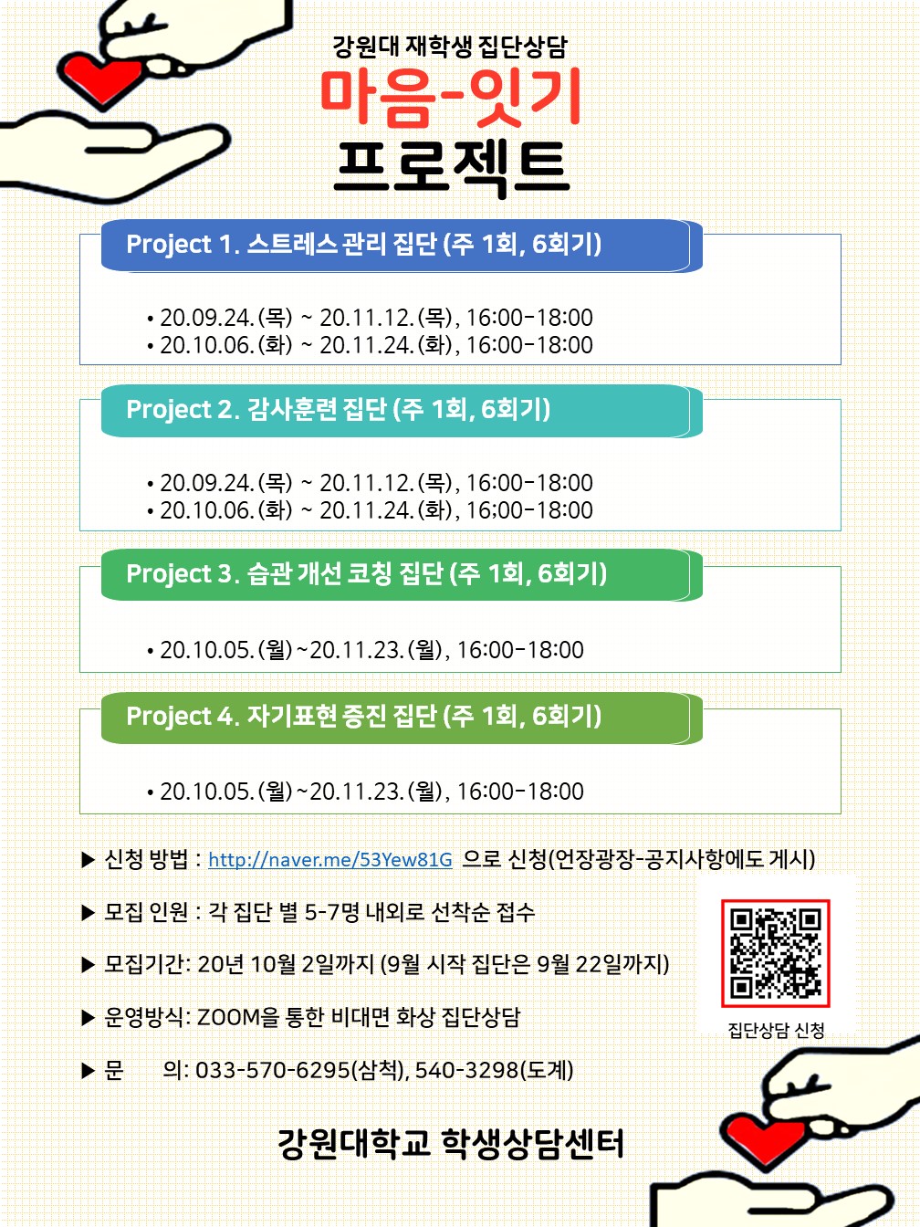 강원대 재학생 집단상담(마음-잇기 프로젝트) 프로그램 안내<삼척-도계캠퍼스>