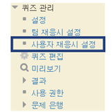 학생에게 재응시 기회를 주기 위해서는 해당 퀴즈 제목 클릭 – 좌측 하단 ‘고급 설정’ 탭 – ‘퀴즈관리’ – ‘사용자 재응시 설정’ 클릭 – ‘사용자 재응시 설정 추가’ 클릭.