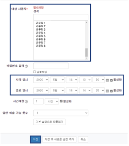 사전 시험 대상자의 경우 ‘시작 일시’ 부분을 변경하시고, 시험 기간 이후 응시자의 경우 ‘종료 일시’ 부분을 변경합니다.