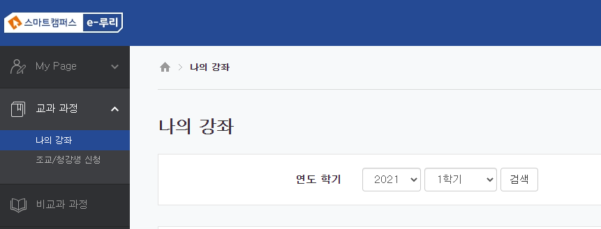( e-루리 홈페이지 - 교과 과정 - 나의 강좌 - 2021학년도 1학기로 설정 후 검색)