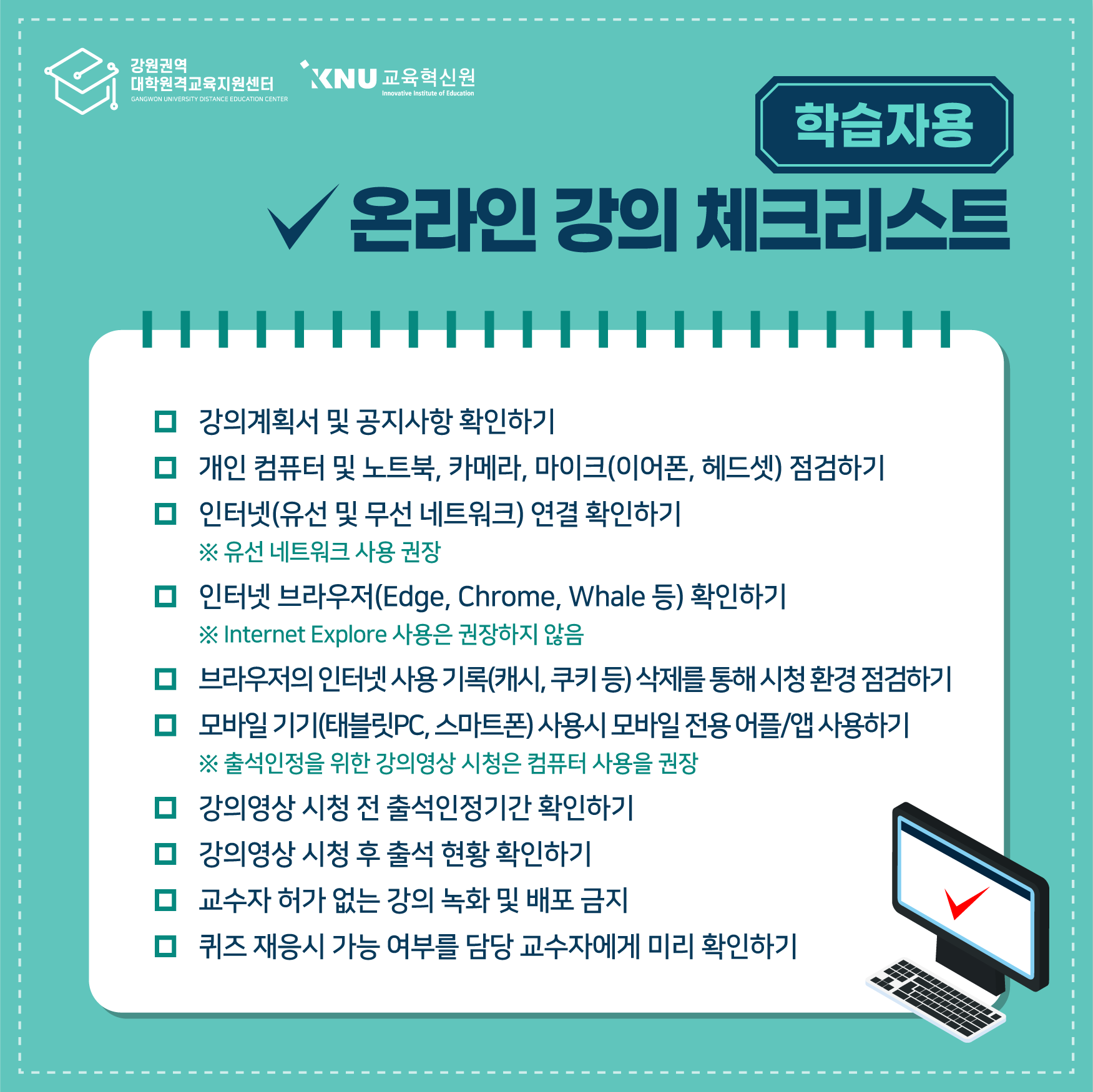 강원권역 대학원격교육지원센터에서 제작한 '온라인 강의 체크리스트'를 배포해 드리오니,
