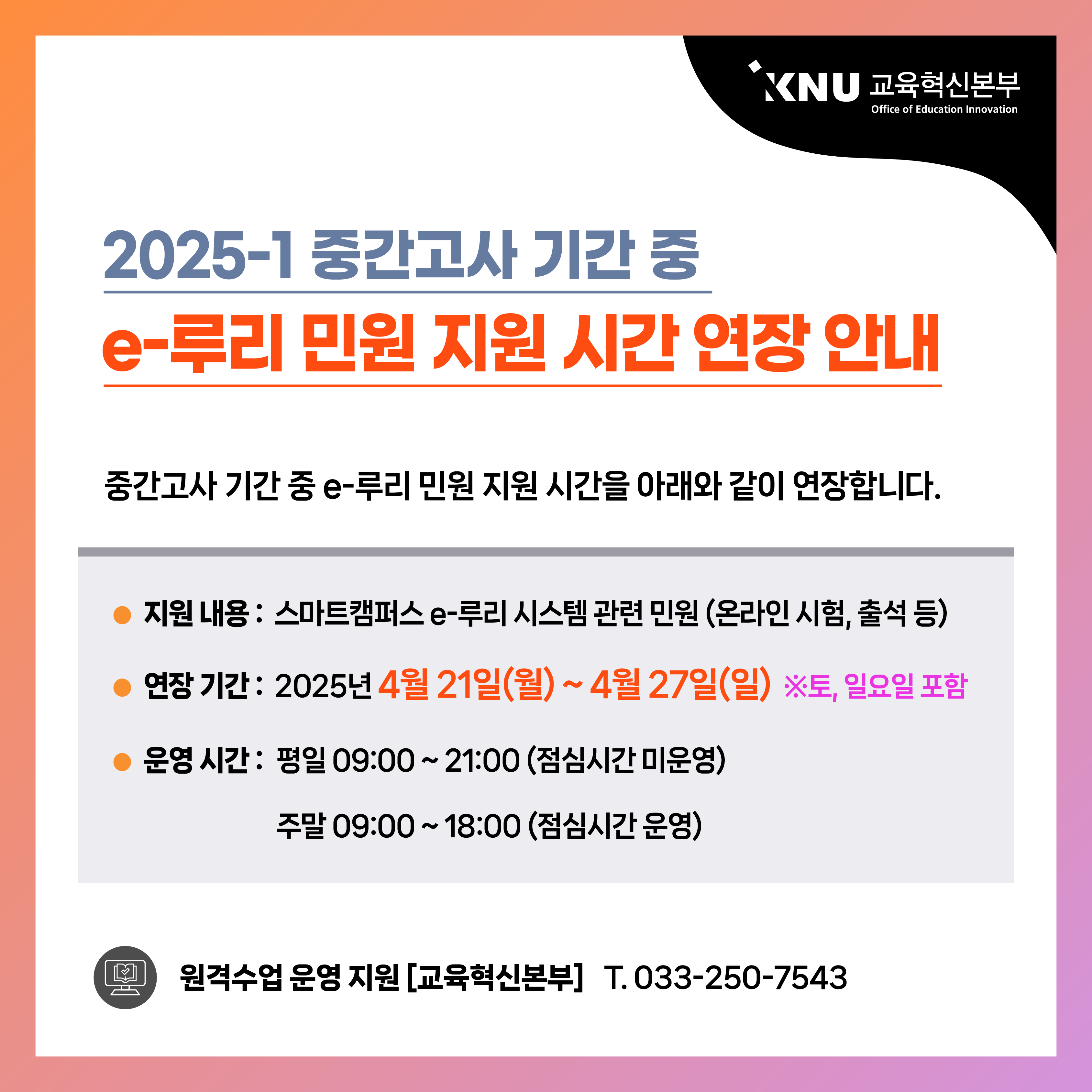 2025-1 중간고사 기간 중 e-루리 민원 지원 시간 연장 안내